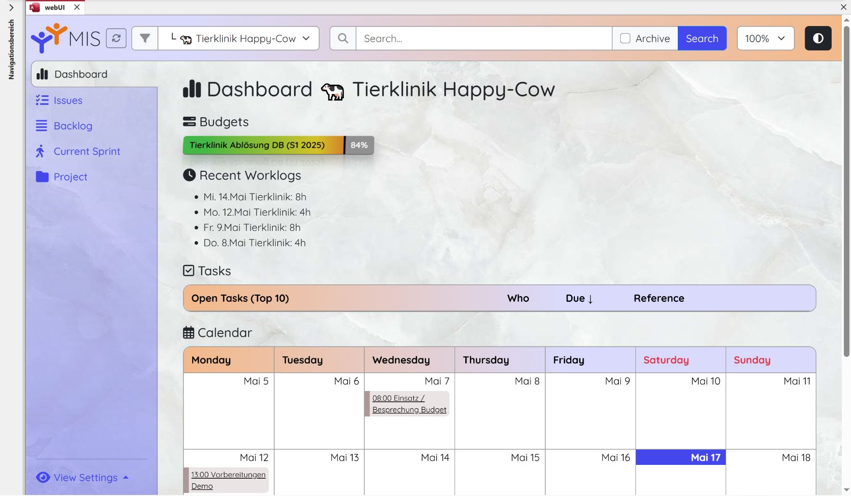 - Im Hauptbereich ist derzeit das Dashboard mit den konfigurierbaren Widgets wie Budgets, Kalender, etc zu sehen