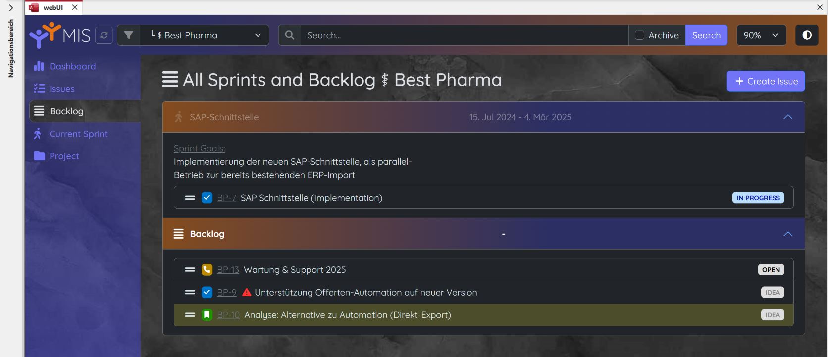 Der "Backlog" Bereich (hier im dark-mode gezeigt) erlaubt beispielsweise das Verschieben (drag&drop) der Tasks in einen